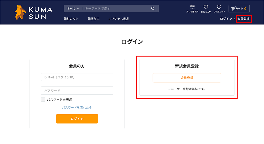 - 注文内容決定後、お客様に「会員登録」(未会員の方)をしていただきます。