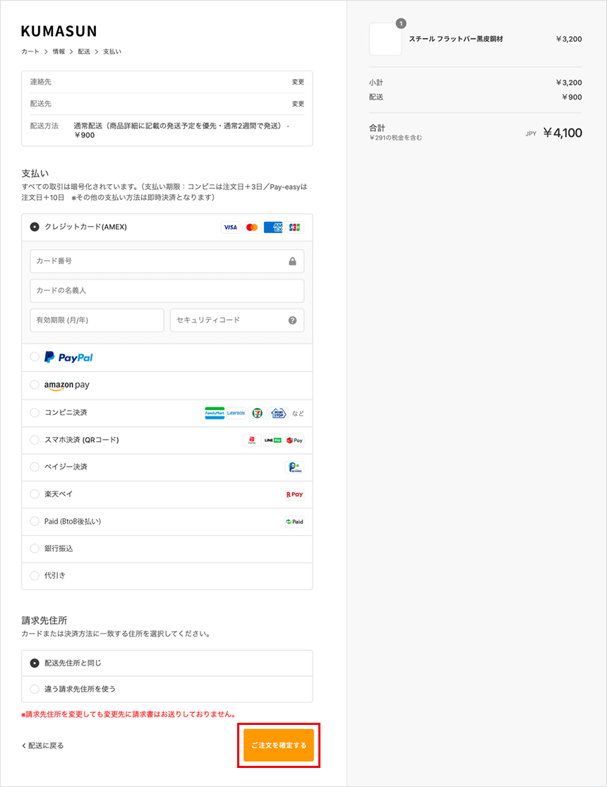 ご希望のお支払い方法を選択後、ご注文内容に間違いがないかご確認下さい。間違いがないようでしたら「ご注文を確定する」をクリックして下さい。