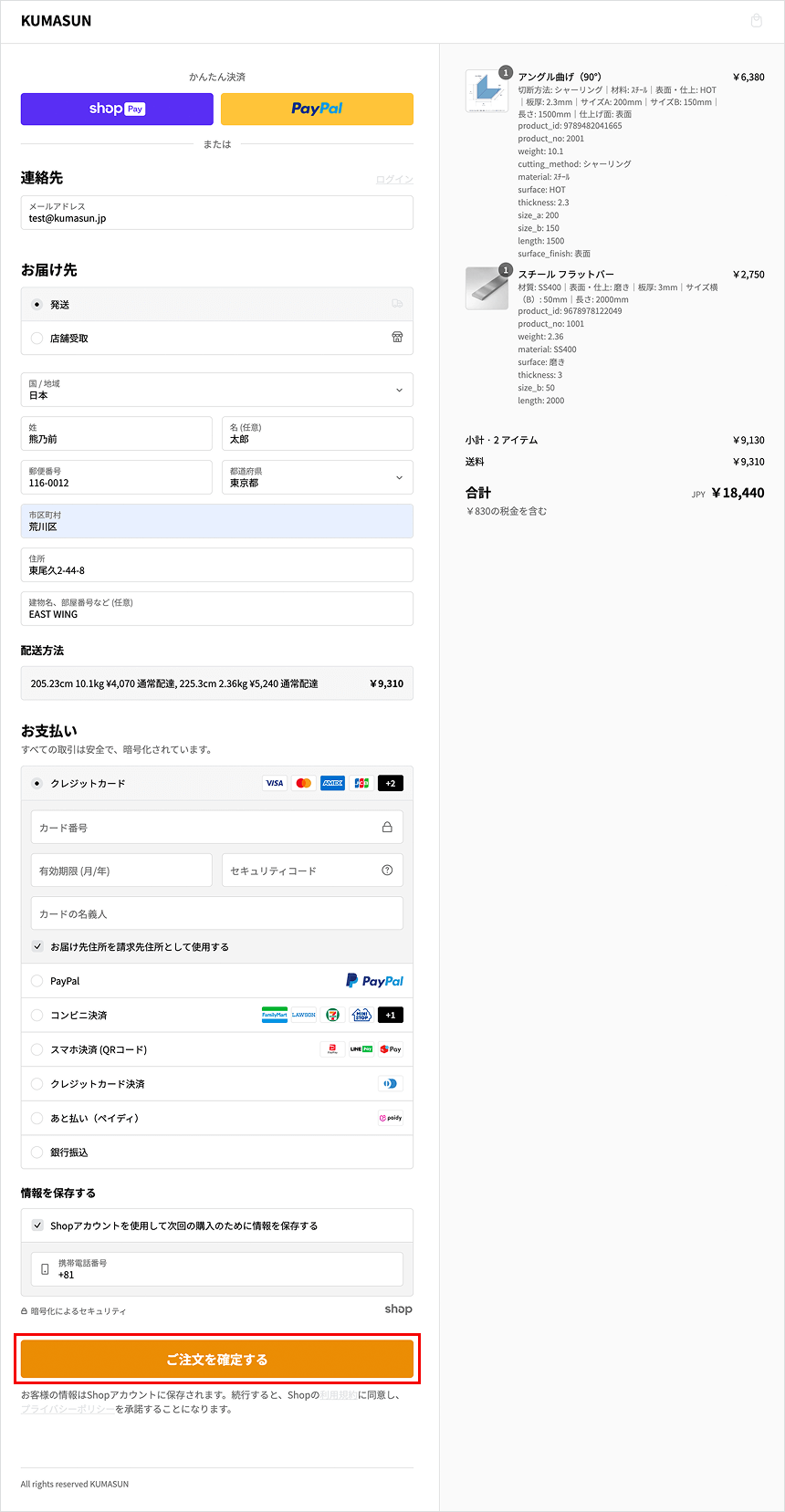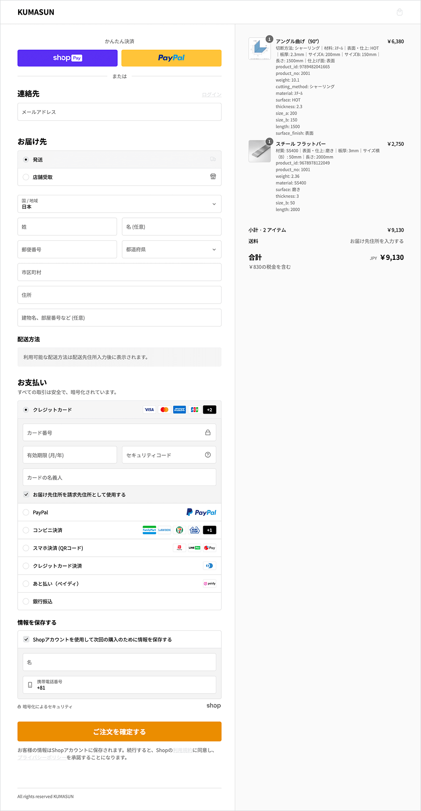- ブラウザが起動し、購入画面にて「配送方法・決済方法」を選択します。「ご注文を確定する」をクリックすると注文完了となります。