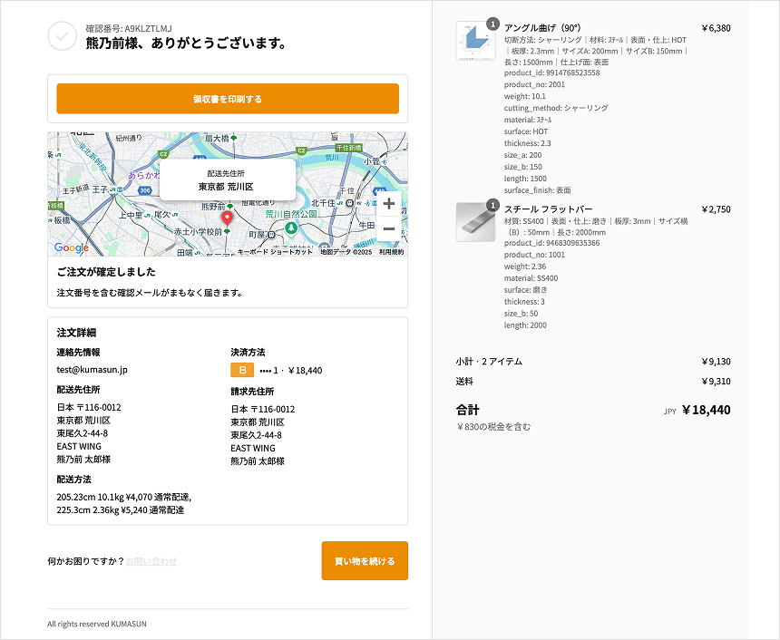 ブラウザが起動し、購入画面にて「配送方法・決済方法」を選択します。「ご注文を確定する」をクリックすると注文完了となります。