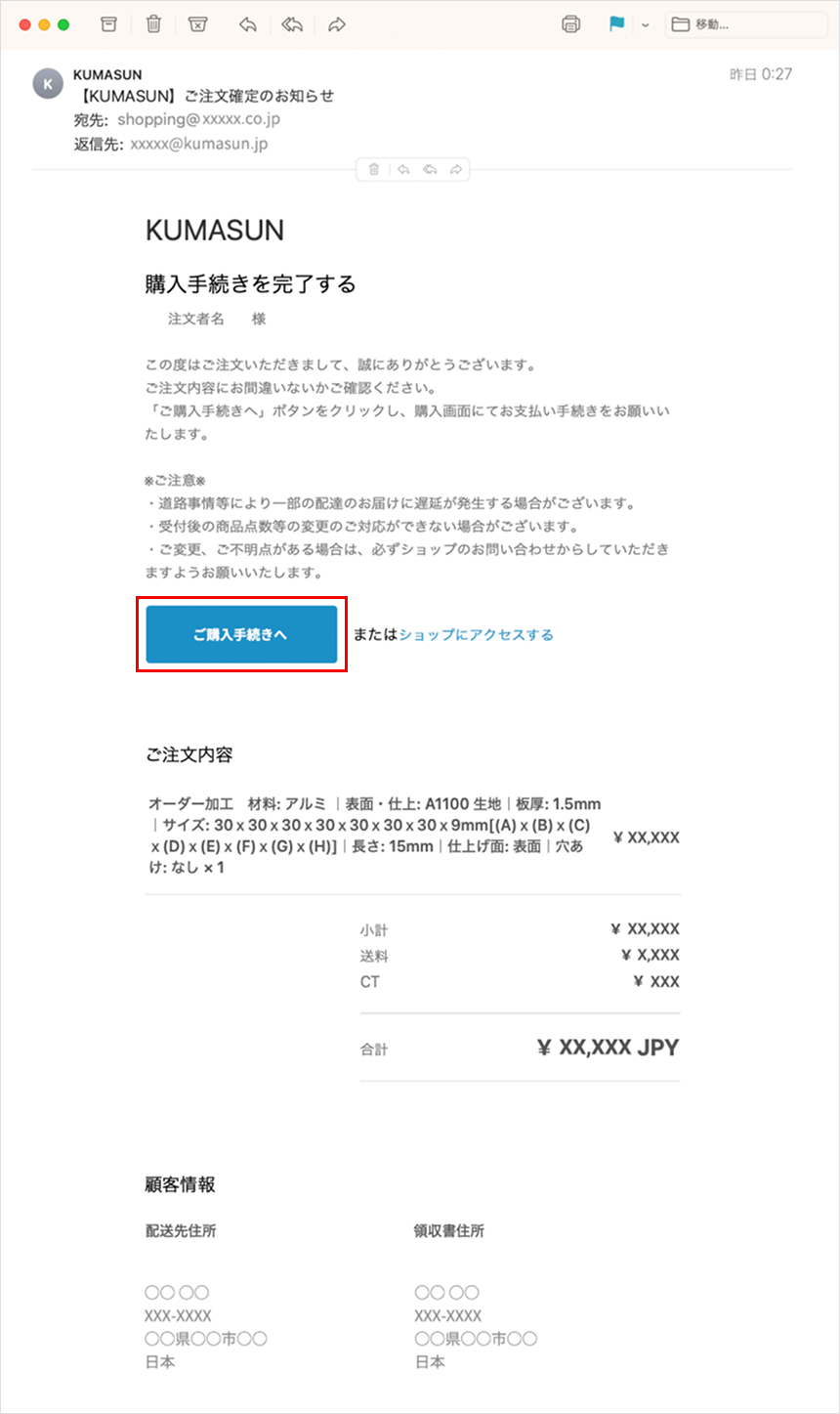 メール受信後、メール内の「ご購入手続きへ」ボタンをクリックします。